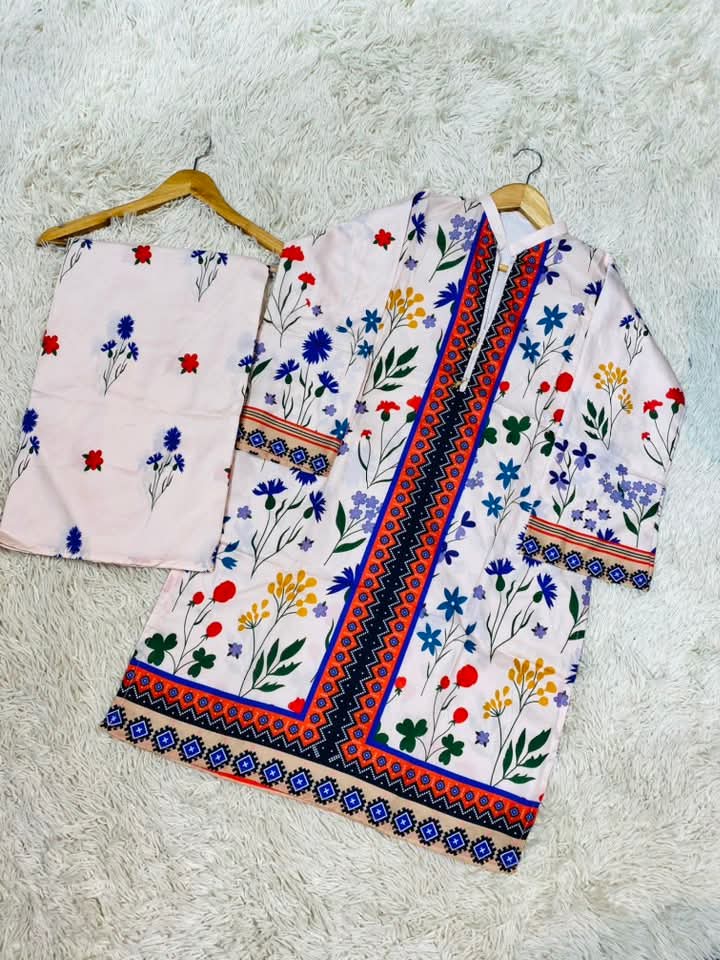This white co-ord set features vibrant multicolor floral prints paired with an ethnic-inspired patterned front panel in red, black, and blue. Designed with printed sleeve borders and crafted from lightweight, breathable fabric, it offers a perfect mix of comfort, style, and elegance for casual outings or festive gatherings.